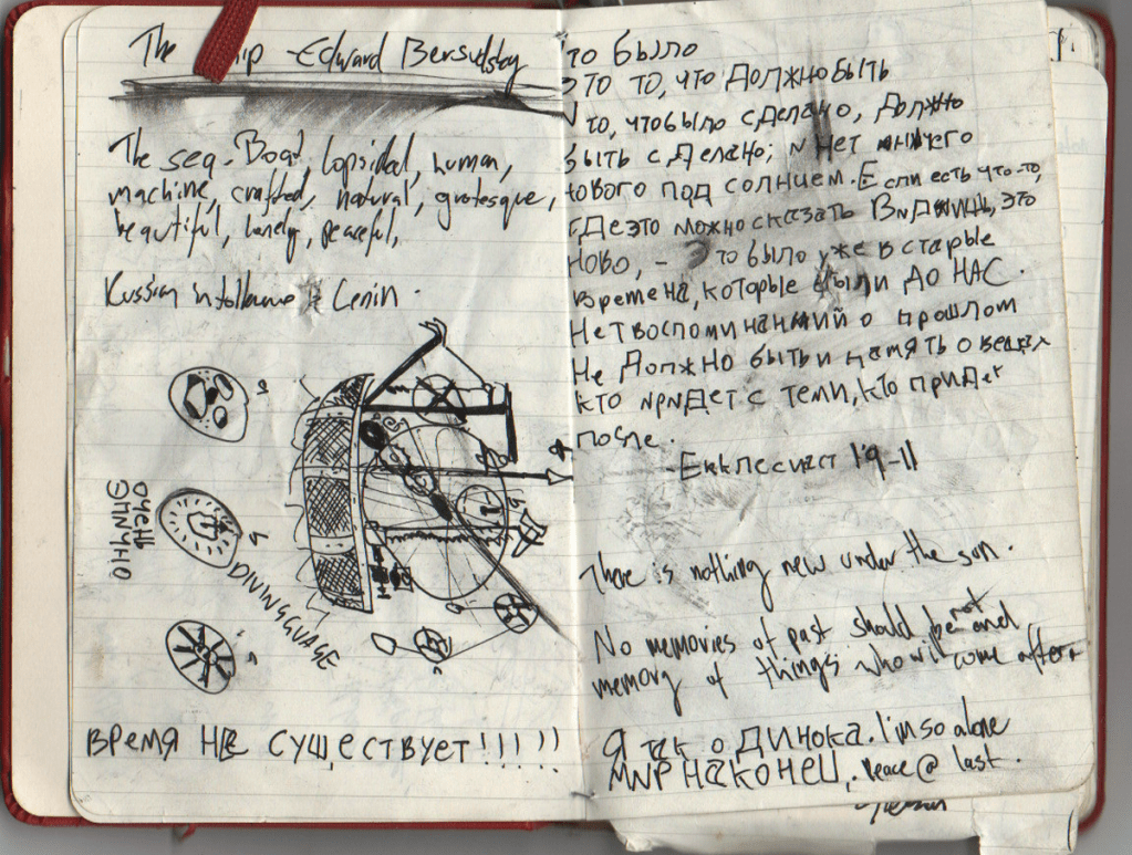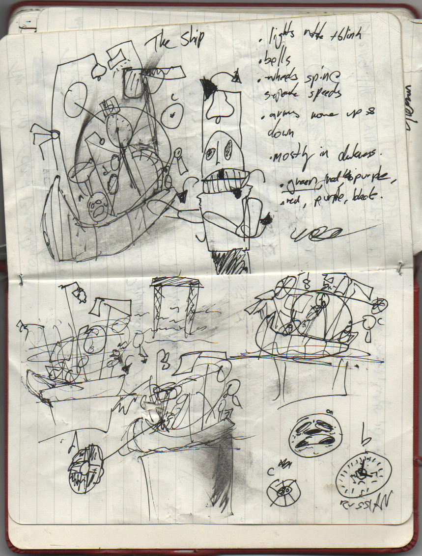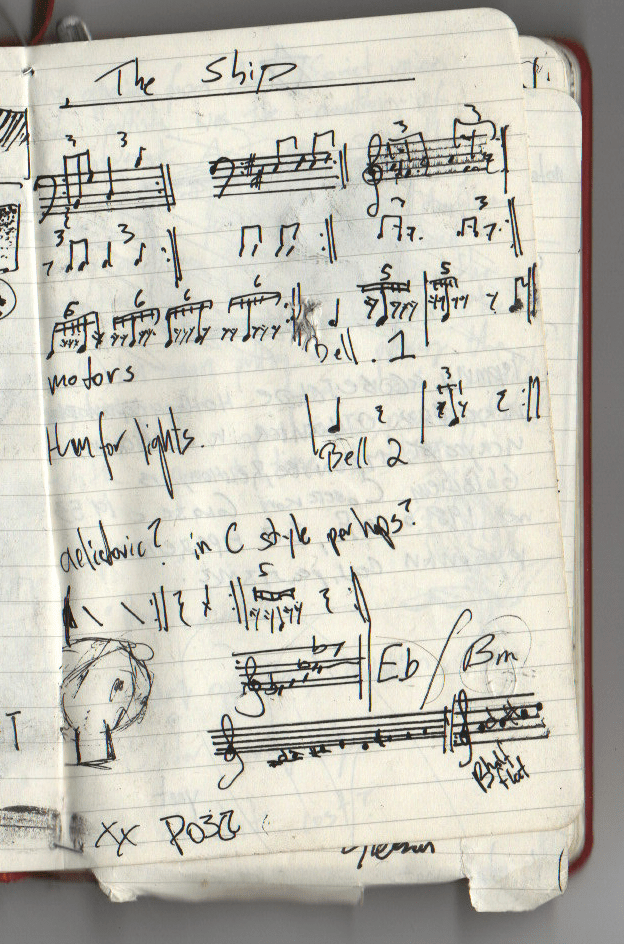 I scribbled and sketched what I had seen in that gallery from memory until I could access the internet to find a clear picture of one sculpture. There was a small boat titled “The Ship” that had no description, unlike the other structures, and it had bells that chimed without a rhythmic framework against each other. That sort of physical sound creation is still a huge part of my composition style.